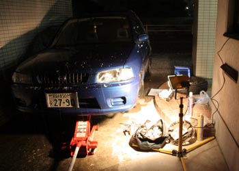 外は雪。松本のときも、尾張旭の実家で作業したときも、なぜか雪の中の作業が多いきがする。事務所前の屋根があるスペースに車を止めて、照明を付けて作業を始める。買ってきたパーツクリーナーをじゃんじゃん使ったが、外で炊く石油ストーブがなかったから爆発はしなかった。