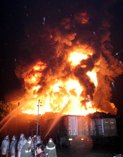 現場に着くと、さらに派手だった。EOS20Dをぶら下げて走り、近づくと、火柱が立っていた。熱気を感じながら、とりあえず、現場を一周する。とりあえず、廃タイヤを扱っている産廃業者の敷地内だけで燃えている格好だったので一安心。それでも、近くに家があって延焼しないか冷や冷やものである。